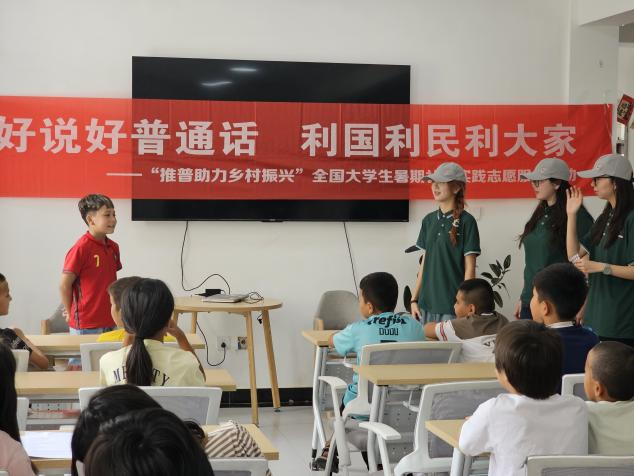 问卷结束后,服务队精心设计的互动环节让现场热度持续攀升:“你画我猜” 游戏里,当地小朋友用灵动的肢体演绎传递语意,引得阵阵欢笑;绕口令教学时,针对 “四”“十” 等易混发音,队员们带领居民反复练习,逐个突破发音难点;声调教学则融入表演元素,通过生动演示让 “一声平、二声扬、三声拐弯、四声降” 的规律变得直观易懂,助力大家快速掌握技巧;队员们还与当地小朋友载歌载舞,在欢快互动中拉近心与心的距离,整个现场洋溢着热烈融洽的氛围。