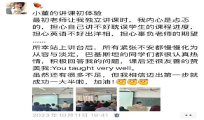 经过一年的摸索与适应,董竹悦明确了自己的目标——成为一名国际中文教师。确定了方向后,她积极参加各类实践活动,积累教学经验。她申请成为国际交流学院汉语课堂的助教,为留学生授课。初次站上讲台的她出于对口语的不自信,显得有些局促,但是在老师的鼓励与帮助下,她一次又一次地站上讲台,和各个国家的留学生交流。