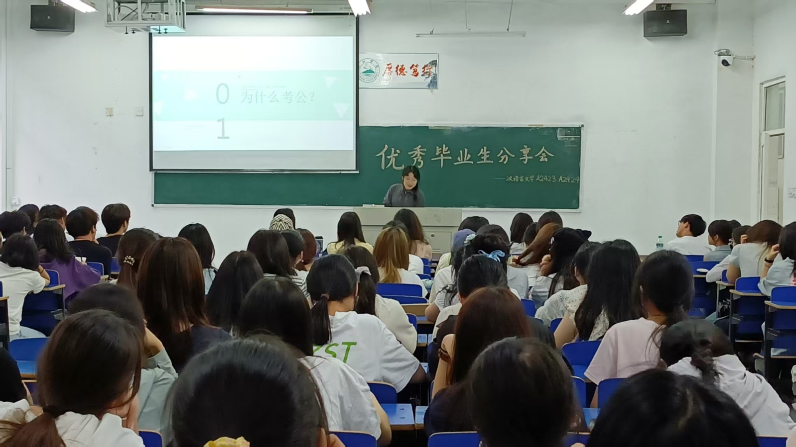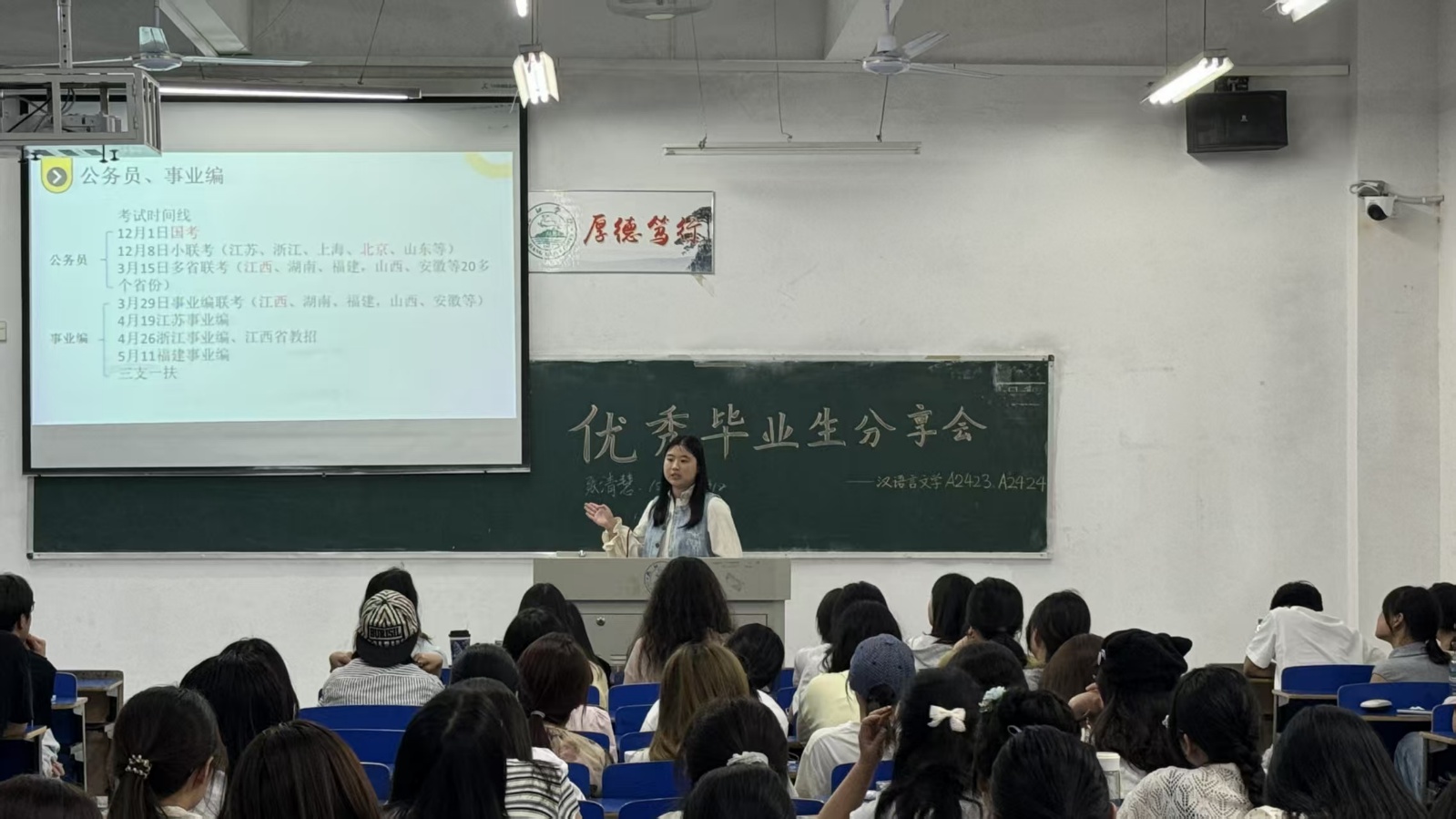 五月浅夏,熏风微暖,为助力我院学子全面了解考研、考公与教师编的最新政策动态,掌握考公与求职的实战技巧,提升综合竞争力,发挥优秀毕业生的榜样引领作用,帮助大学生明晰职业发展规划,5月25日,yl6809永利YL集团在104教室举办“优秀毕业生经验分享交流会”。特邀张清慧、严美慧两位在考公考试中表现优异的学子分享经验,汉语言文学专业学生参加,现场气氛热烈,互动频频。