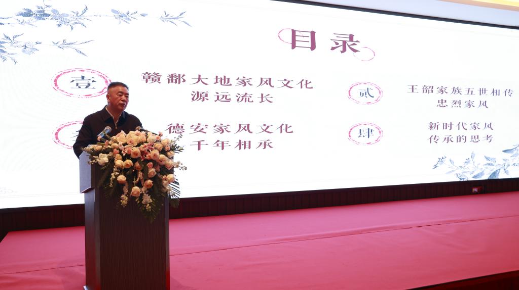 朱虹教授以《王韶与家风文化》为题,深入剖析了王韶家族的家风文化。他通过讲述王韶提出《平戎策》、王寀机智脱险等故事,展现了王韶家族五世相传的忠烈家风以及德安家风文化的千年传承。朱虹教授还探讨了新时代家风传承面临的挑战,并提出了创新传播、强化教育、制度保障等解决路径及德安的实践成果。
