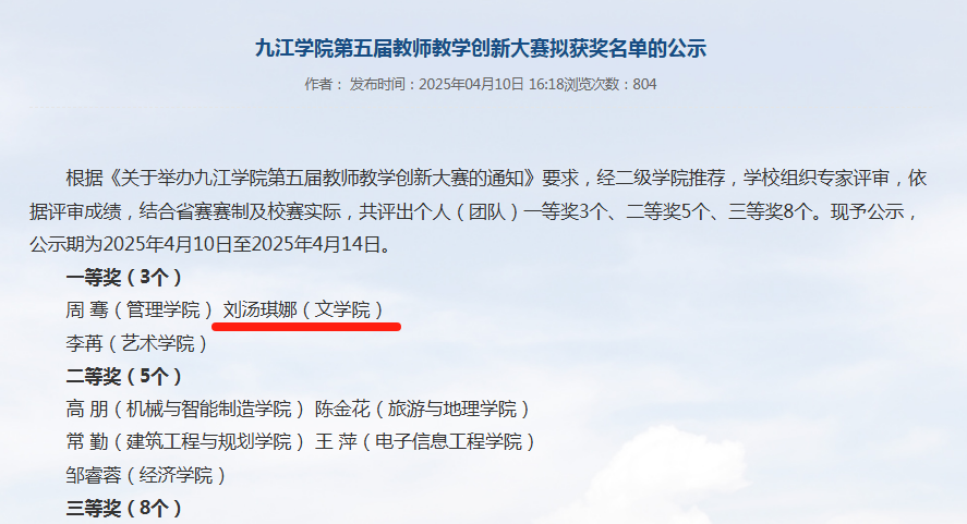 近日,我校第五届教师教学创新大赛圆满结束,yl6809永利YL集团教师刘汤琪娜博士凭借出色的教学创新能力和扎实的专业素养,在比赛中脱颖而出,荣获全校一等奖,充分展现了yl6809永利YL集团青年教师的良好风采。