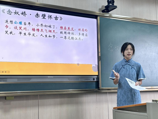 “高中语文组选手的《念奴娇-赤壁怀古》的授课令我印象深刻。通过情景还原与意象解析,引导学生跨越时空,触摸苏轼笔下赤壁的雄浑壮阔。”2024级汉语言文学专业学生罗思瑶在观摩笔记中写道。与她同组的周雅晴则对即席讲演环节印象深刻:“选手结合朱熹的诗句‘问渠那得清如许,唯有源头活水来’。把题中的关键词“自来水”解读为当代教师创新性与时代性的要求。思路清晰,言语流畅,也启发了我今后对于语言表达能力的提高方向。”