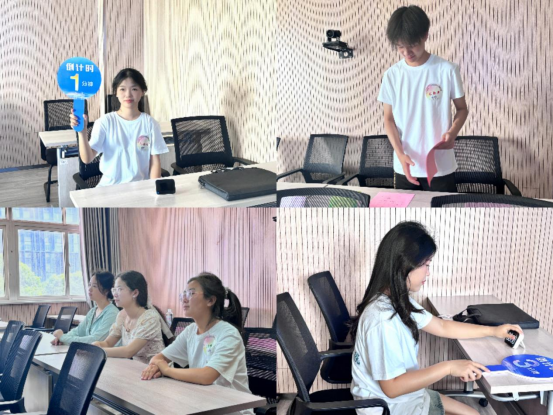 在模拟上课环节,志愿者夏若岚、裴新甜负责微格1教室的计时举牌工作。“选手们10分钟的授课浓缩了教学设计、板书、互动等多项技能,我必须精准把控时间,这是对参赛者的尊重,也是对我的锻炼。”夏若岚表示,通过近距离观察学长学姐的临场表现,自己对未来教学实践有了更清晰的规划。