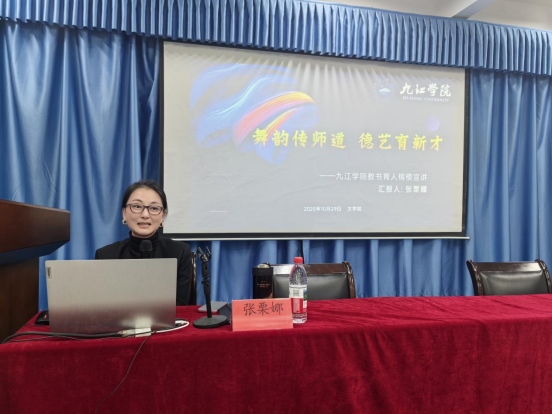 报告会上,张栗娜教授以《舞韵传师道,德艺育新才》为题,结合二十余年教育实践,通过鲜活案例与深情讲述,生动诠释了新时代师德师风的深刻内涵。她以原创舞蹈作品《瑶光赋》《大湖之灵》为例,分享如何通过艺术创作传承江西地域文化,实现“以美育人、以文化人”的教育理想;更以“乡村美育支教”“一对一艺术帮扶”等实践项目,展现高校教师服务社会的责任担当。同时,张教授深入阐释了师德师风的时代内涵,并结合舞蹈美育与乡村教育实践案例,分享了艺术教育与师德修养深度融合的路径。