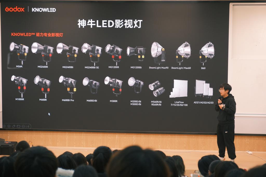神牛公司市场负责人张佳妍从影视灯光的技术演进切入,系统介绍了从传统卤钨灯到现代LED灯具的技术革新。她重点解析了不同功率灯具的特性,包括在短剧拍摄中高频使用的2400瓦灯具、广告拍摄中广泛应用的平板灯系列等。结合影视制作、短视频直播等多元场景,张佳妍还分享了“神牛杯”高校视频大赛的参赛信息与细则,鼓励学生将理论知识转化为创作实践。