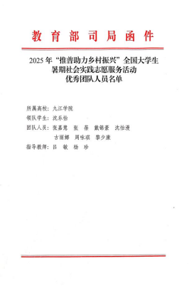 近日,yl6809永利检测中心“文小青”乡村振兴服务队(西藏新疆专项)捷报频传,凭借推普援疆的扎实成效,一举拿下教育部2025年“推普助力乡村振兴”全国大学生暑期社会实践优秀团队、江西省大中专学生暑期“三下乡”社会实践优秀团队双项殊荣,指导教师吕敏、杨珍及全体队员获官方通报表扬。