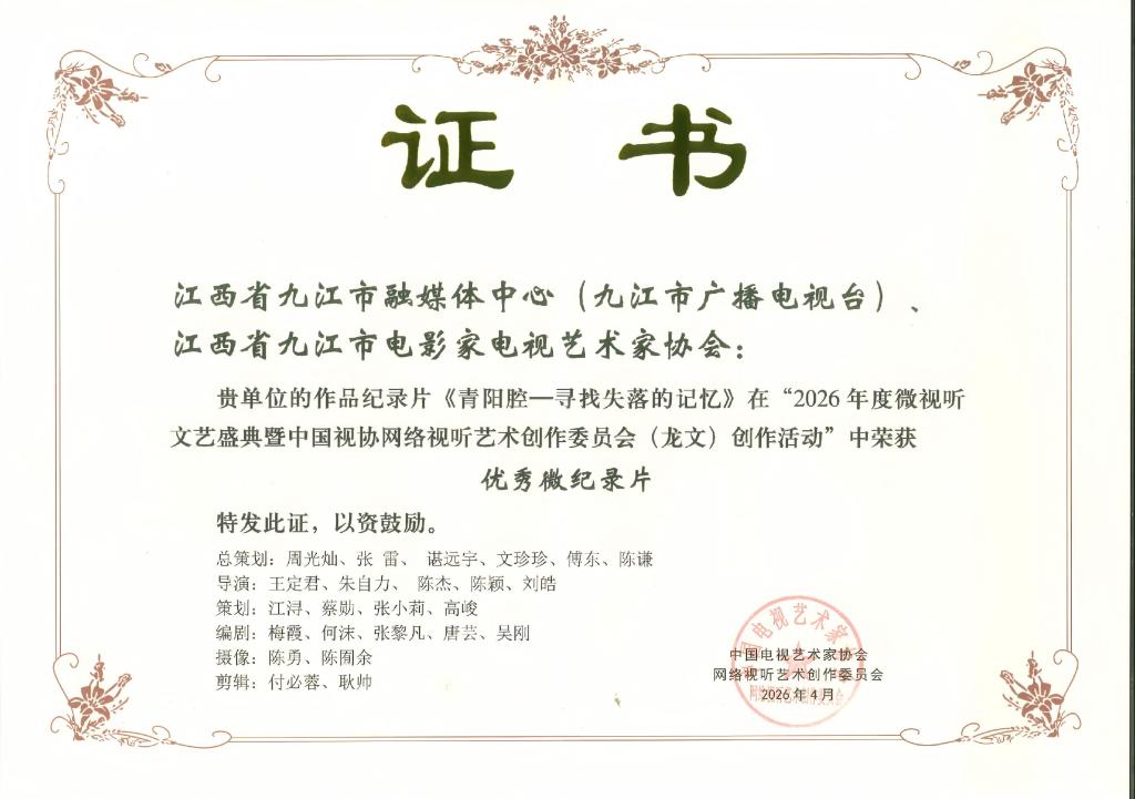 纪录片《青阳腔》系统记录了这一拥有四百余年历史、作为徽剧和黄梅戏等剧种母体的国家级非物质文化遗产的起源与传承。盛典评委会对该片给予高度评价,认为其“以扎实的田野调查、深情的叙事视角和精良的视听制作,为古老戏曲声腔留下了一份珍贵的时代影像志,在非遗题材纪录片中具有标杆意义”。