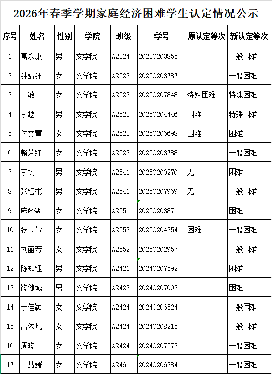 根据《江西省教育厅等七部门关于印发江西省家庭经济困难学生认定暂行办法》的通知(赣教发[2019]6号)、江西省教育厅《关于印发〈江西省学生资助工作操作规程〉的通知》(赣教助〔2025〕1号)及《关于印发《yl6809永利检测中心家庭经济困难学生认定操作规程》等系列文件的通知》(九院字[2025]81号)文件精神,经个人申请,班级评审、年级审核、yl6809永利YL集团家庭经济困难评审工作小组研究,葛永康等17名同学作为2026年yl6809永利YL集团春季家庭经济困难学生认定人选。现将其有关情况公示如下: