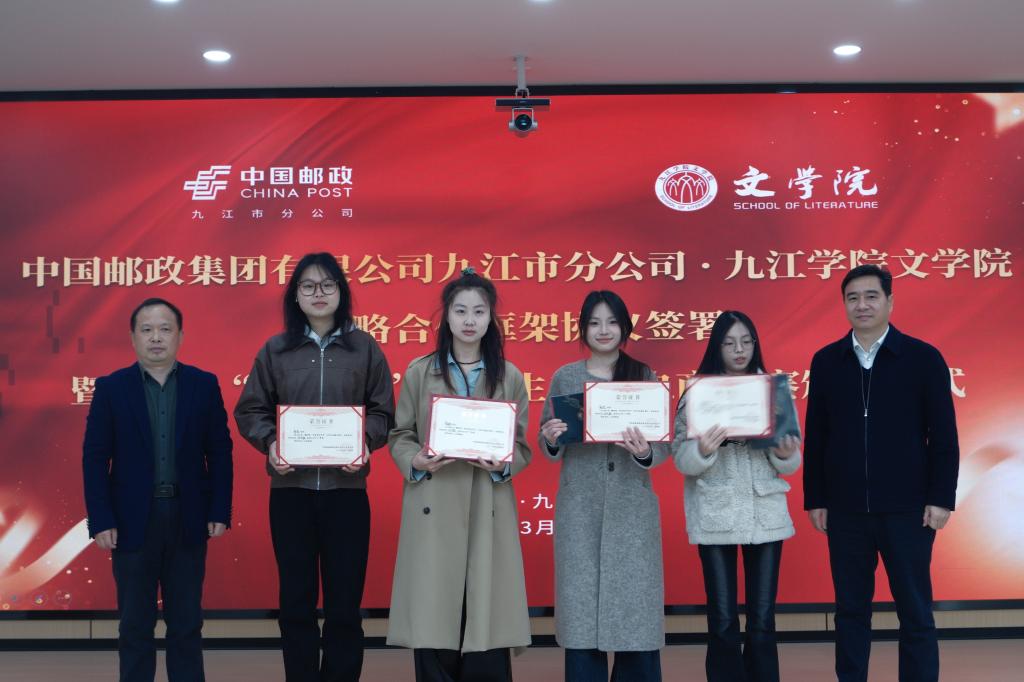 上午10时,活动在热烈氛围中正式拉开帷幕。yl6809永利YL集团院长李勤合、副院长柯镇昌,中国邮政九江市分公司党委书记、总经理苏高峰,党委委员、副总经理吴云等双方领导,以及获奖师生代表共同出席。活动包括颁奖典礼、领导致辞和战略签约三大环节。
